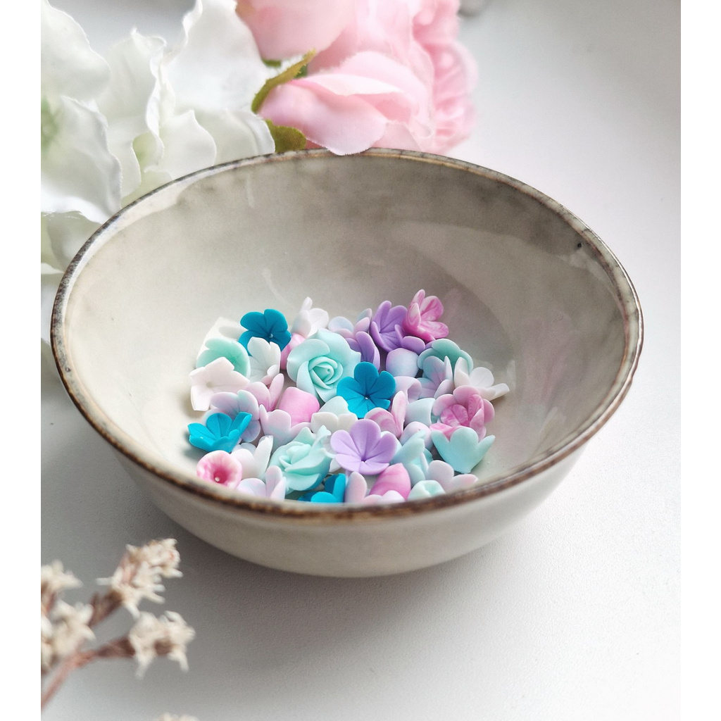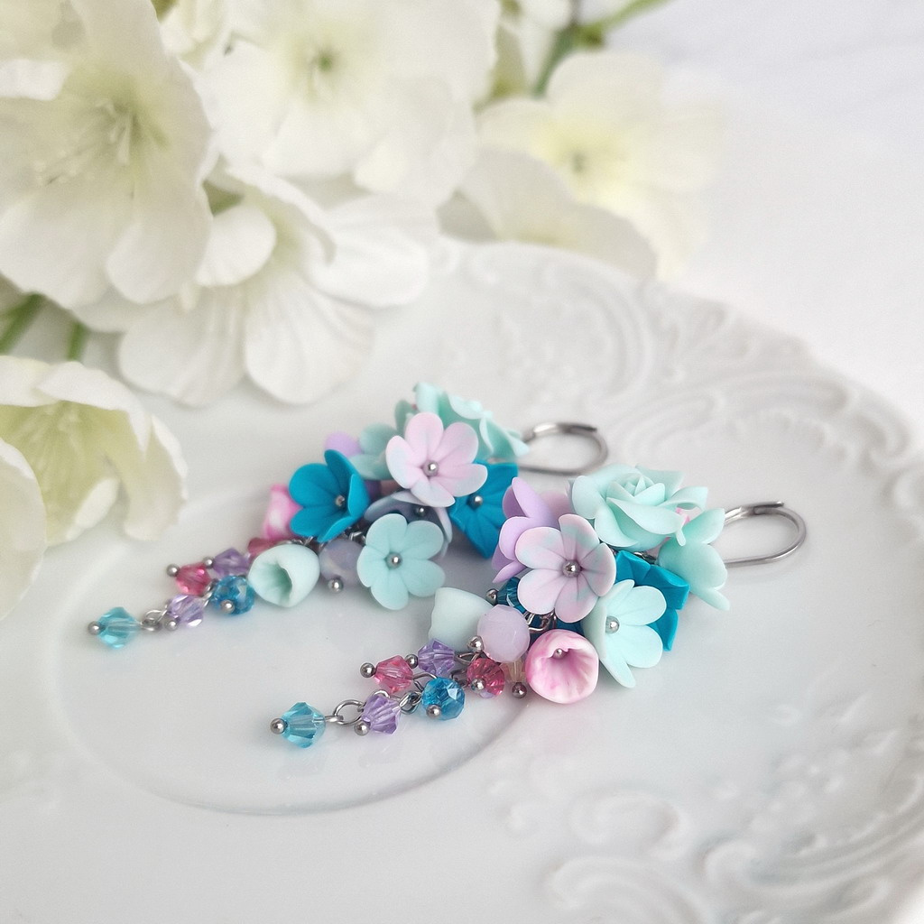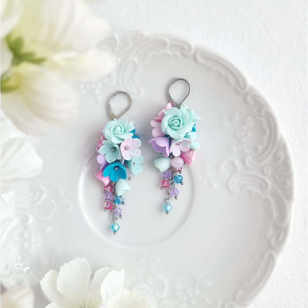 Jsou zhotovené z chirurgické oceli, takže se nemusíte bát alergických reakcí ani změny barvy kovu. Každý pár zdobí množství ručně tvořených květů v nádherné kombinaci jasných barev - mátové, syté tyrkysové, růžové a světle fialové.