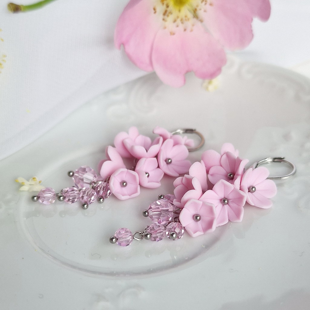 Okouzlující, ručně vyrobené náušnice s pastelově růžovými kvítky a českými skleněnými krystaly s dokonalým leskem.