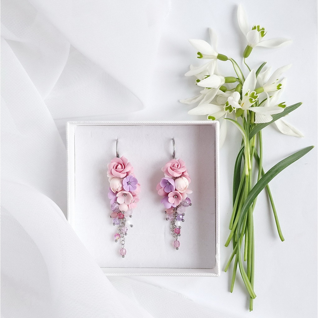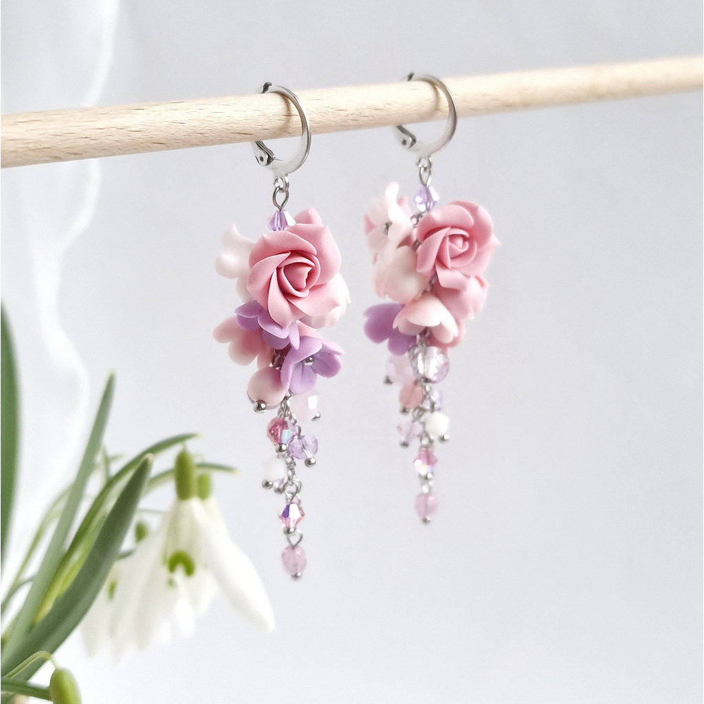 Shailene - dlouhé květinové náušnice s růžemi a pivoňkami
