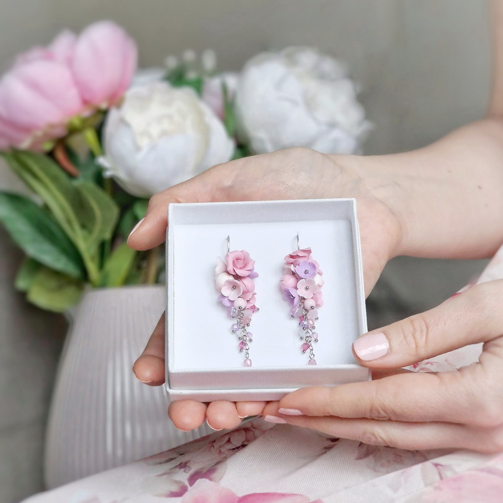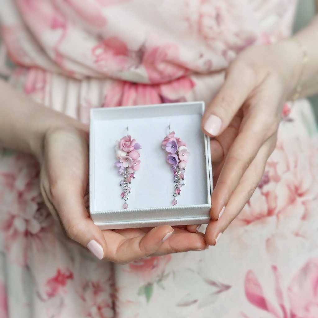 Jsou zhotovené z chirurgické oceli, takže se nemusíte bát alergických reakcí ani změny barvy kovu. Každý pár zdobí množství ručně tvořených květů v nádherné kombinaci jemných pastelových odstínů růžové, bílé a světle fialové.