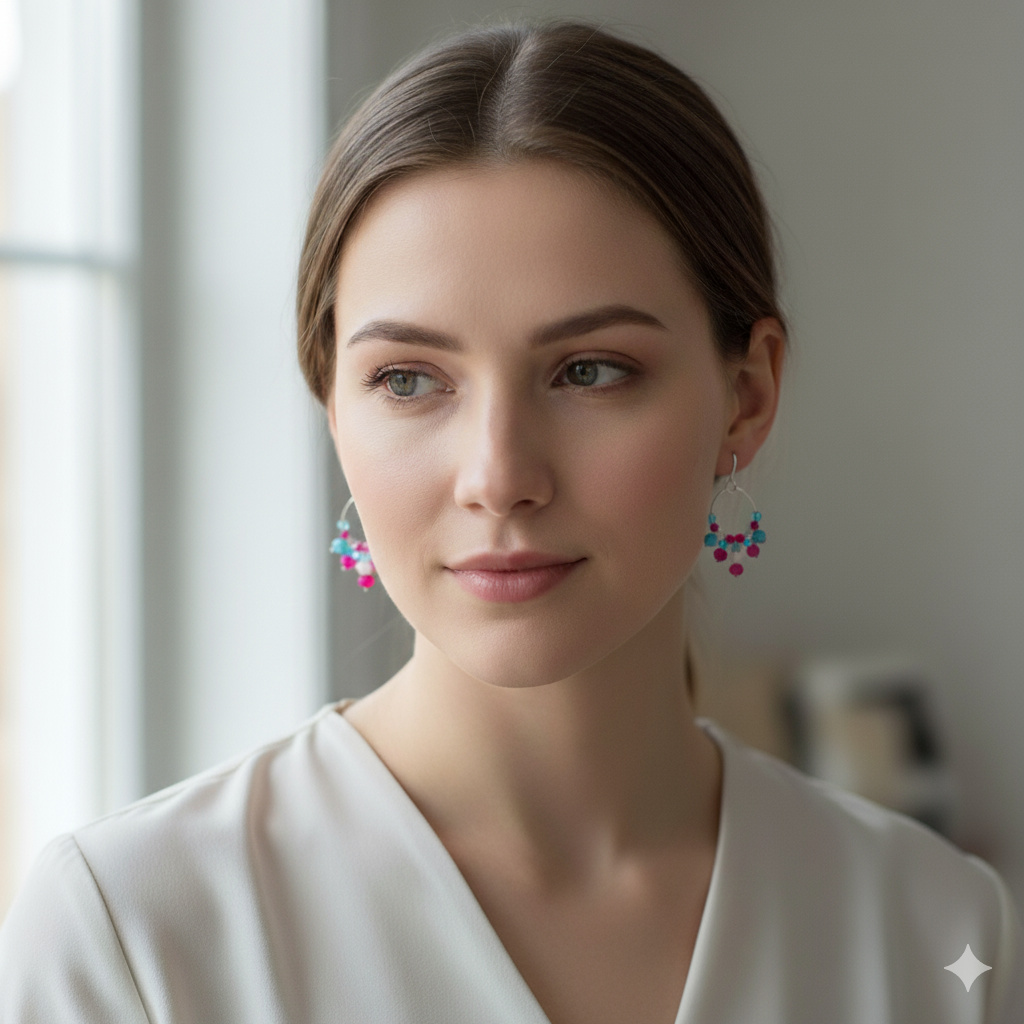 Tyto neokoukané náušnice jsou pečlivě složené z množství skleněných krystalků, ladících tvarem i barvou.