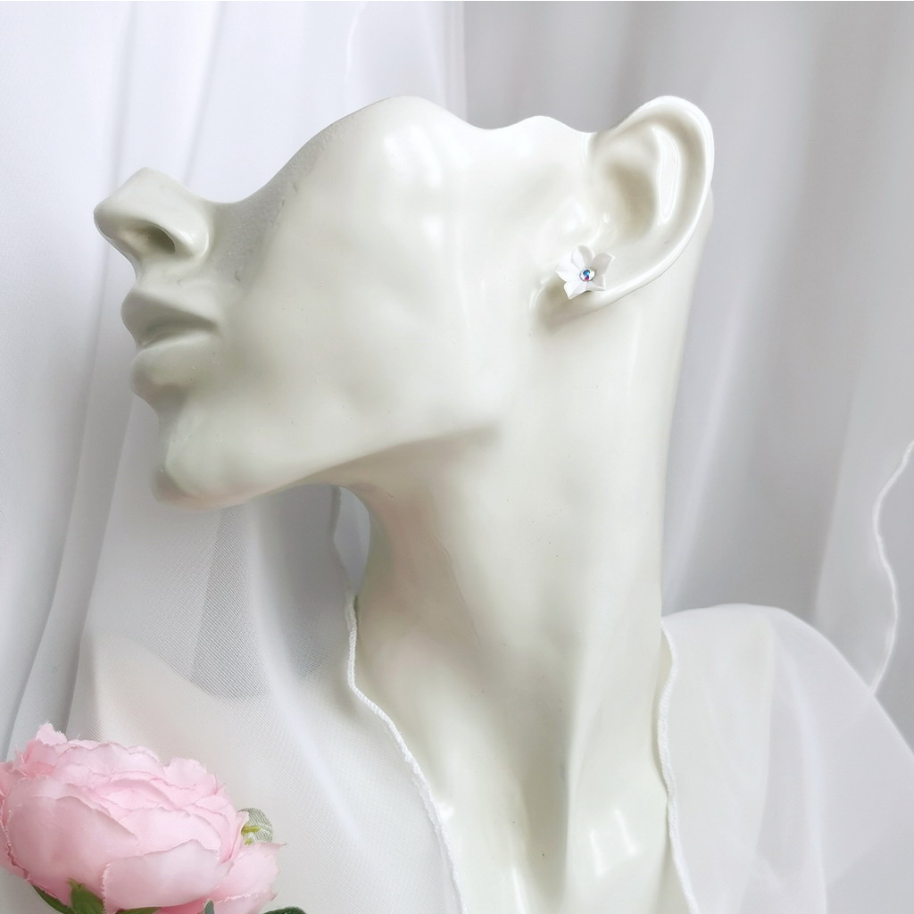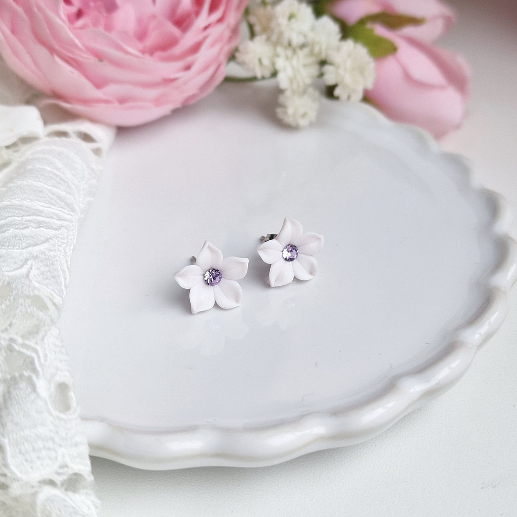 Každý okvětní plátek je vytvořený ručně, s největší pečlivostí a láskou. Ve středu kvítku září malé skleněné šatony v decentní šedo-fialové barvě, které odráží světlo a nádherně se třpytí. Puzety z chirurgické oceli zajistí komfortní nošení.