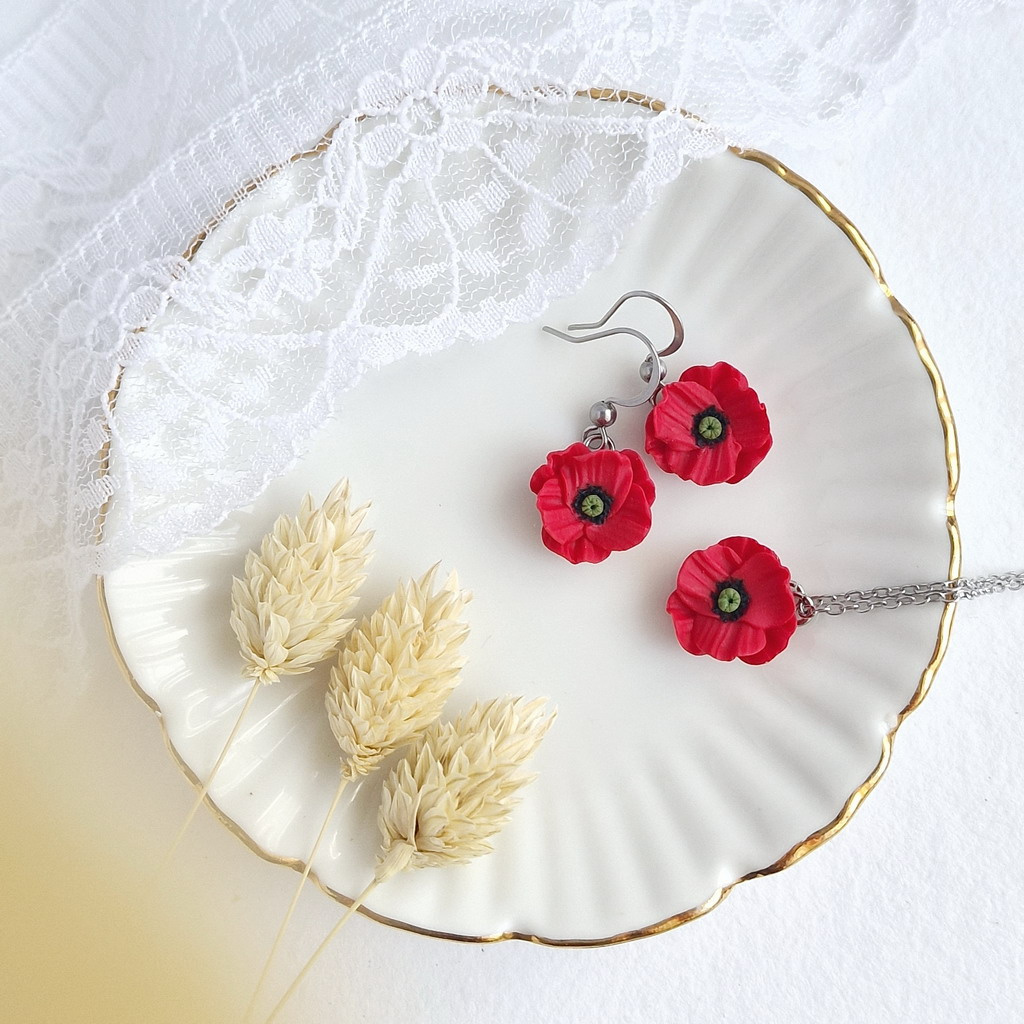 Představte si otevřenou letní krajinu, kde slunce příjemně hřeje a květy tančí s nespoutaným větrem... A přesně takový je pocit, který v sobě ukrývá tento set náušnic a přívěsku na řetízku s vlčími máky.