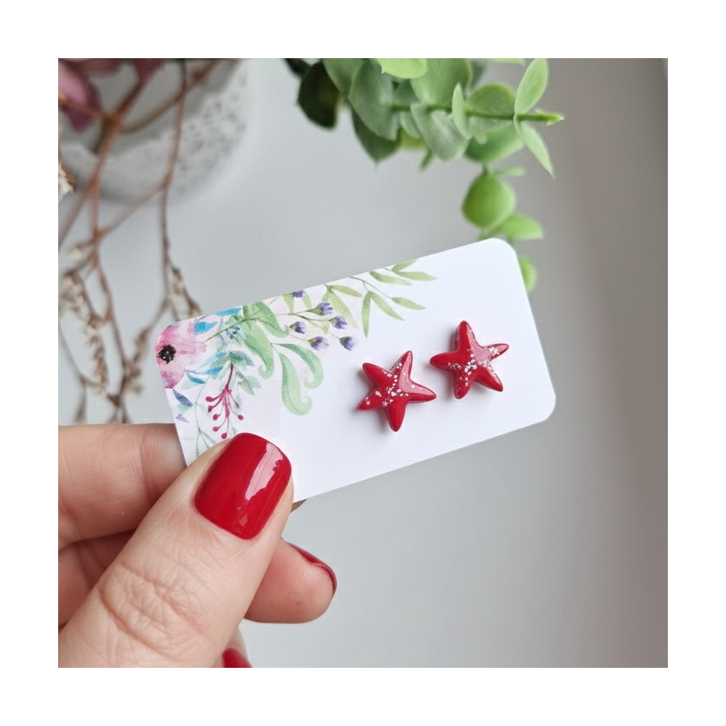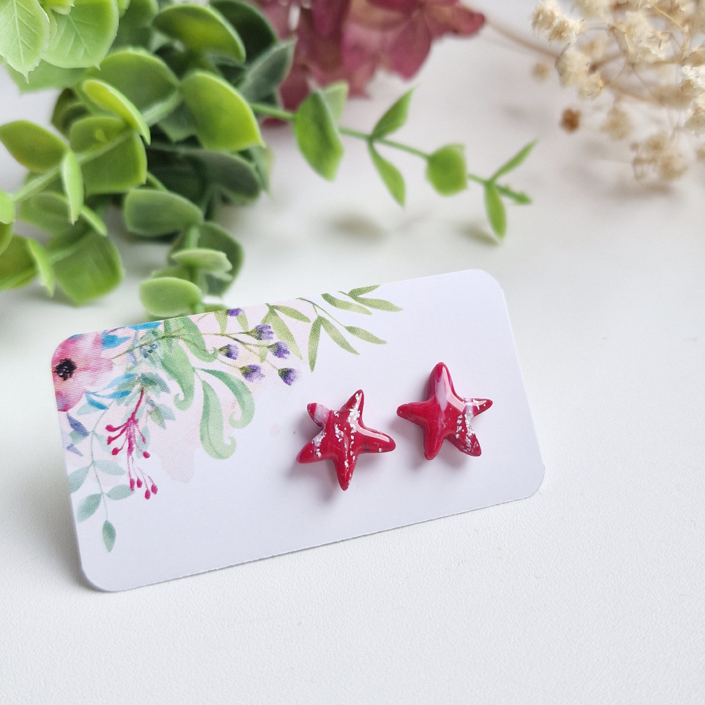 Hravé, ručně tvořené náušnice ve tvaru asymetrických hvězdiček. Díky speciální technologii výroby má každá náušnice neopakovatelný dekor v červené barvě s bílým a stříbrným mramorováním, žádné dva kousky nejsou úplně stejné. Hvězdičky jsou zalitá pryskyřicí, takže se krásně lesknou.
