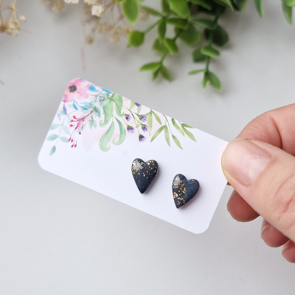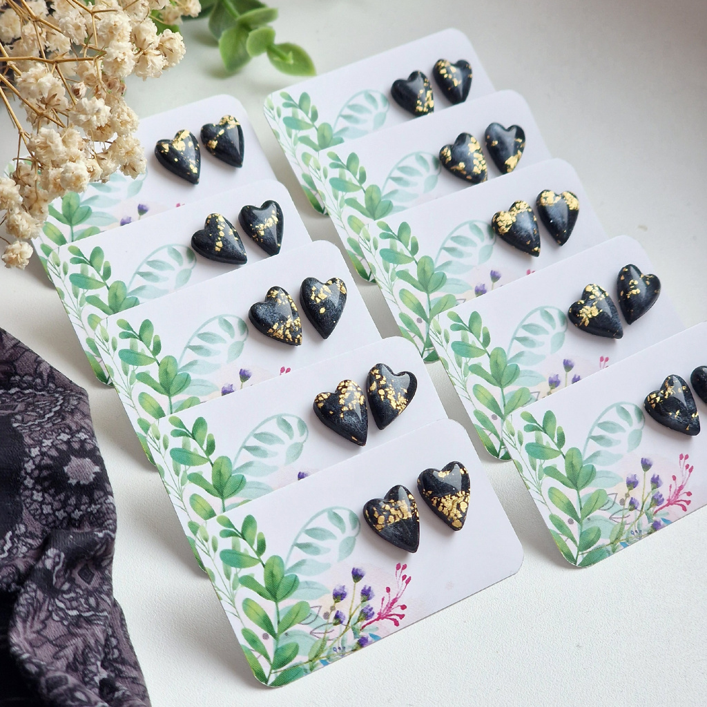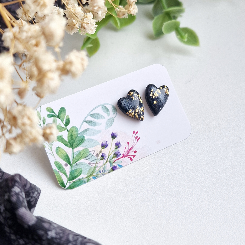Hravé, ručně tvořené náušnice ve tvaru podlouhlých srdíček. Díky speciální technologii výroby má každá náušnice neopakovatelný dekor ve stříbřitě černé barvě se zlatými třpytkami, žádné dva kousky nejsou úplně stejné. Srdíčka jsou zalitá pryskyřicí, takže se krásně lesknou.