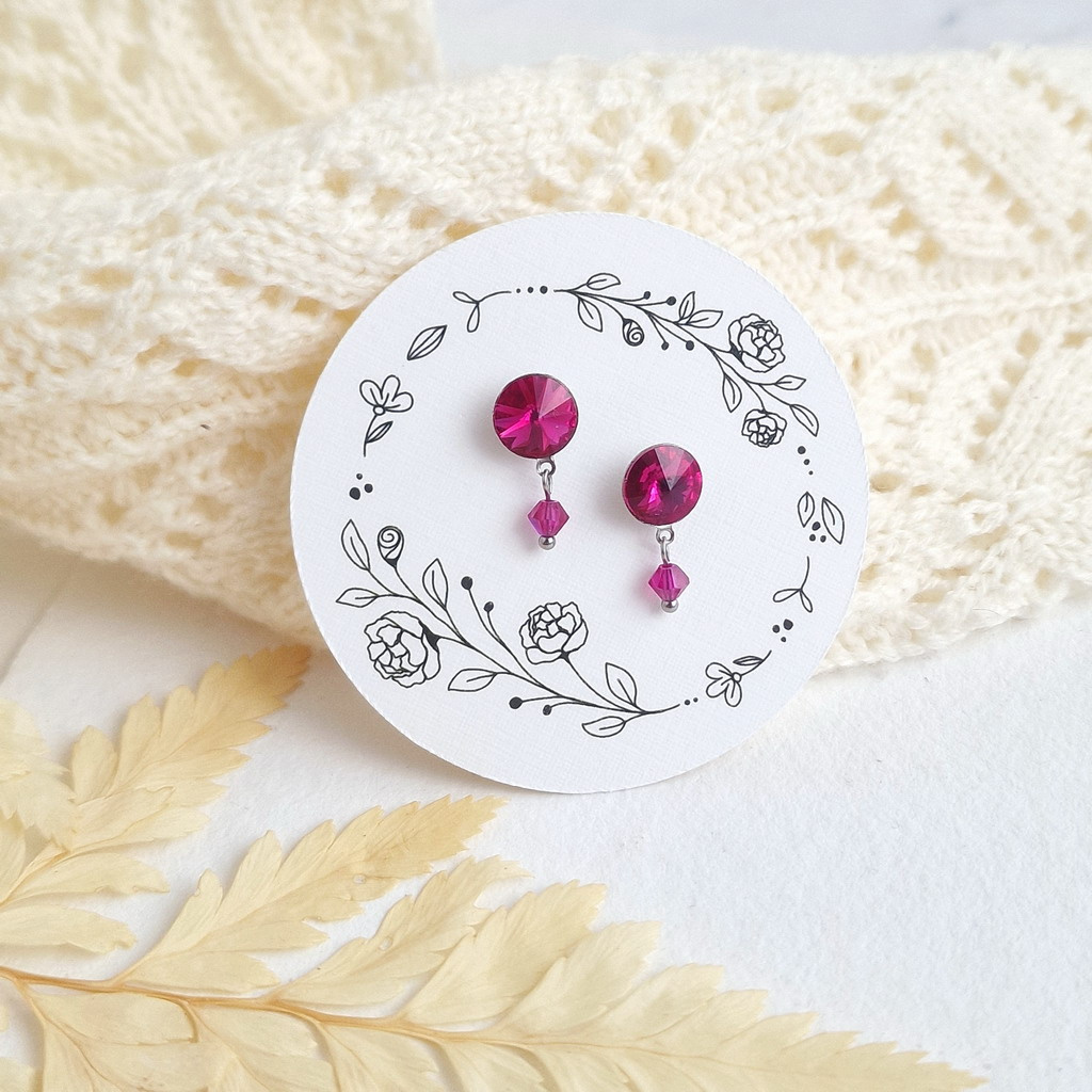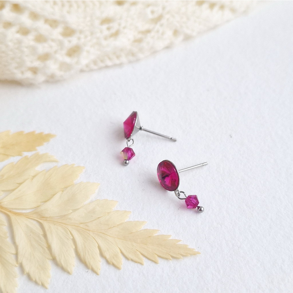 Tia - ocelové náušnice se skleněnými krystaly fuchsia