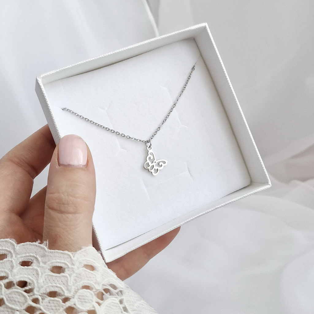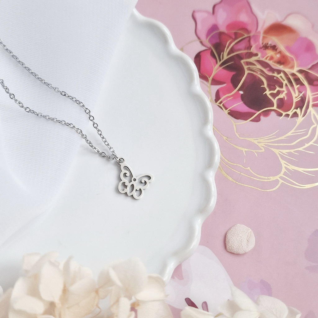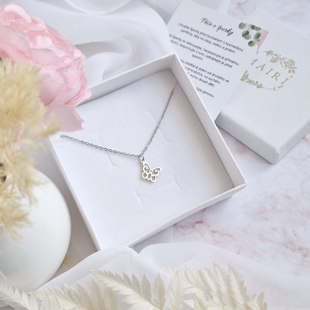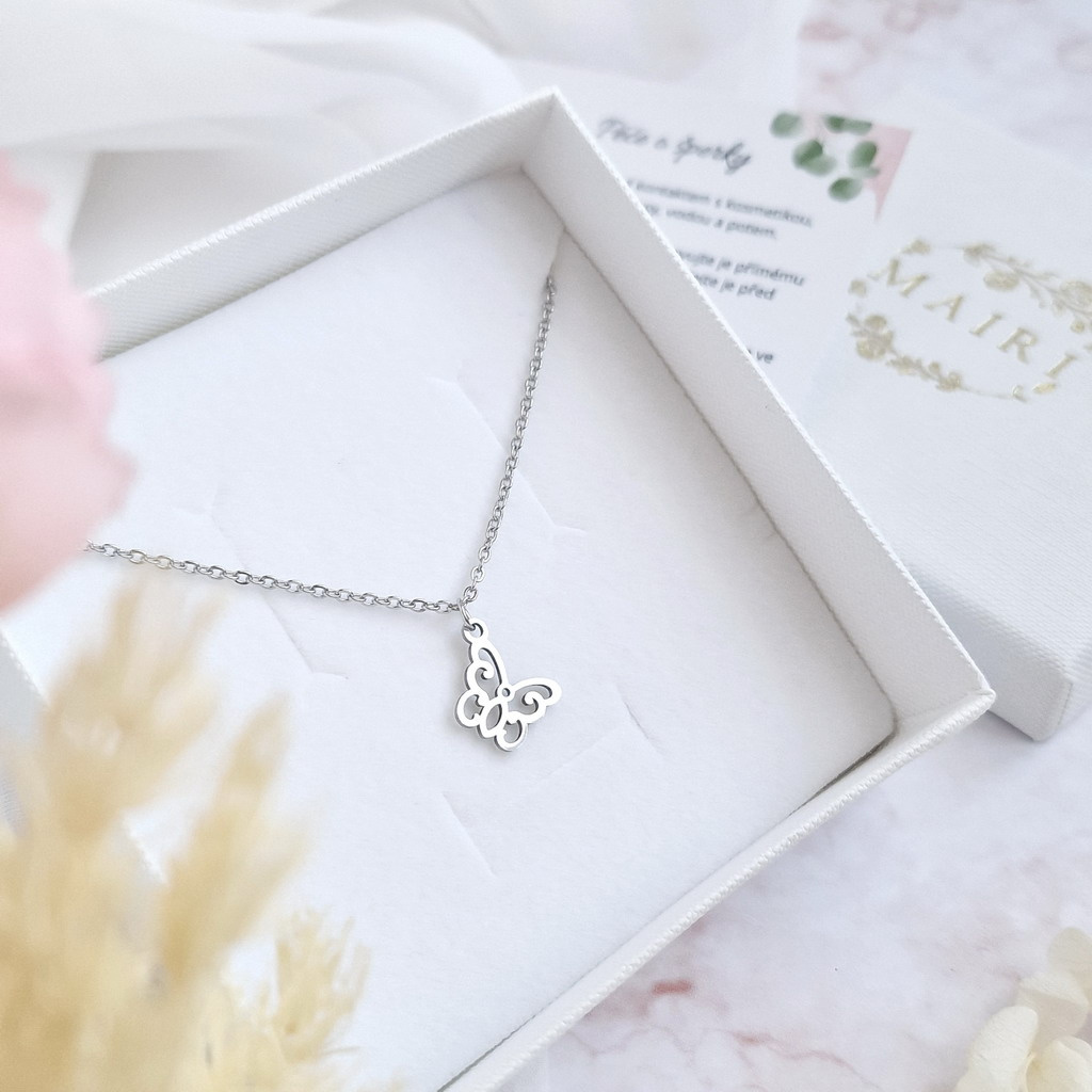 Půvabný přívěsek motýlka na jemném řetízku z chirurgické oceli.