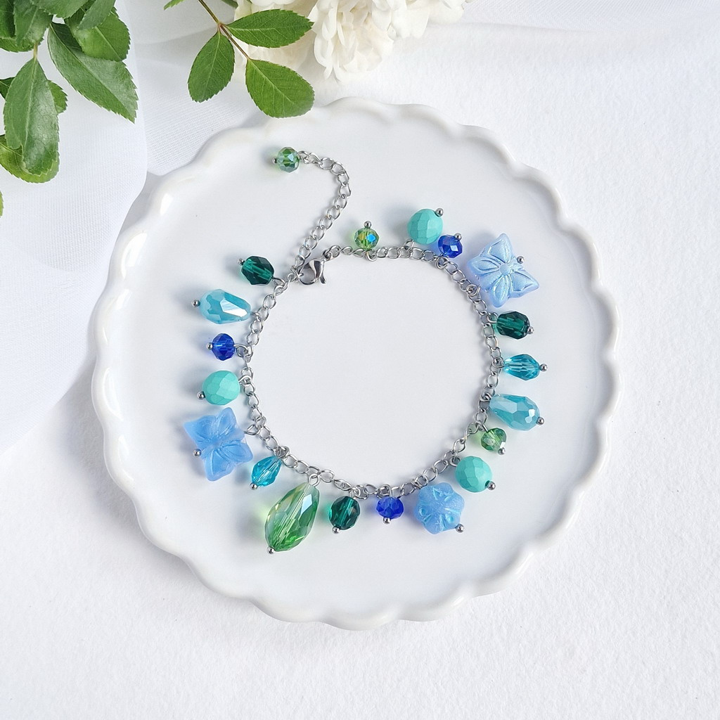 Kombinuje něžnou krásu květů z polymerových hmot, lesk a třpyt skleněných korálků a pevnost a odolnost nerezové oceli.