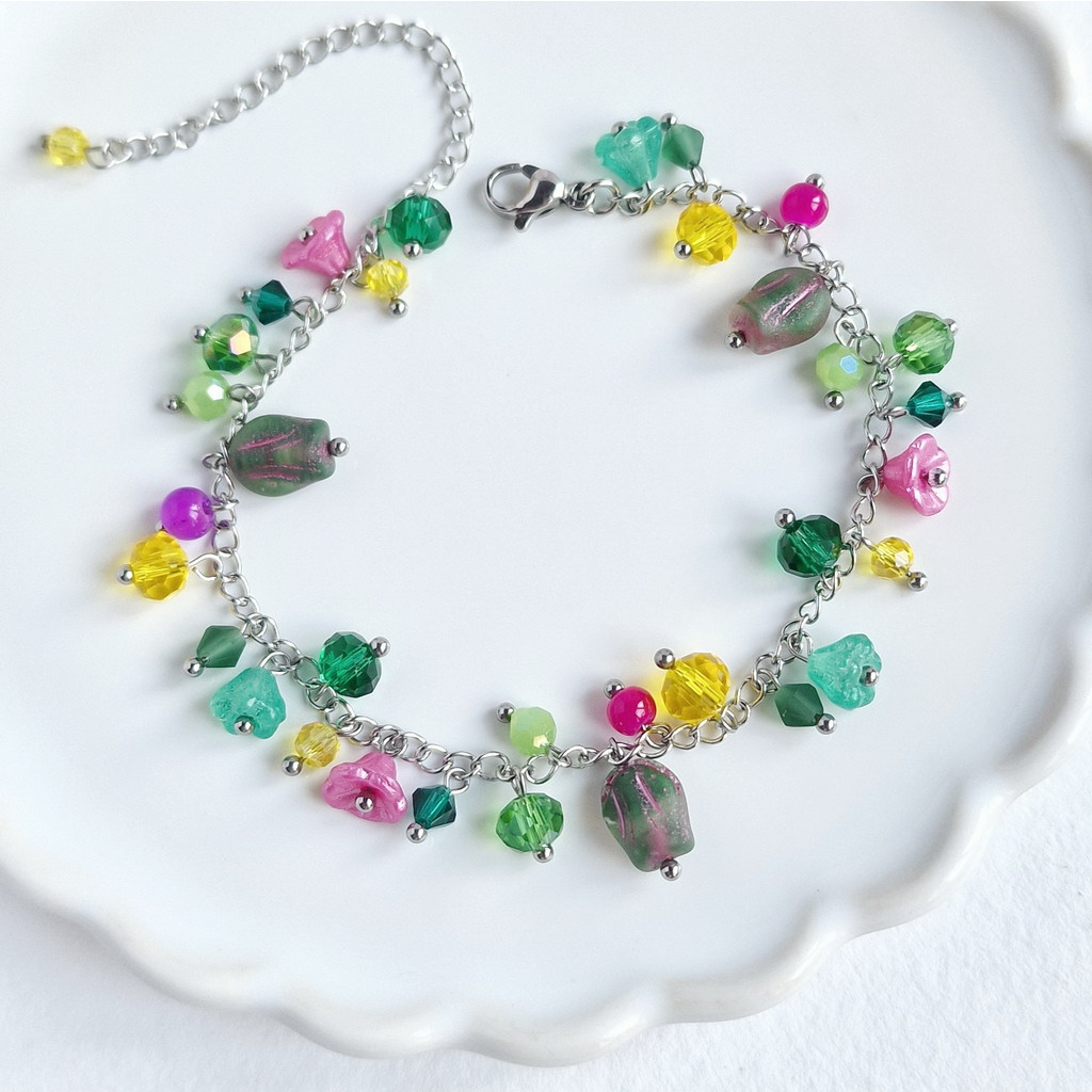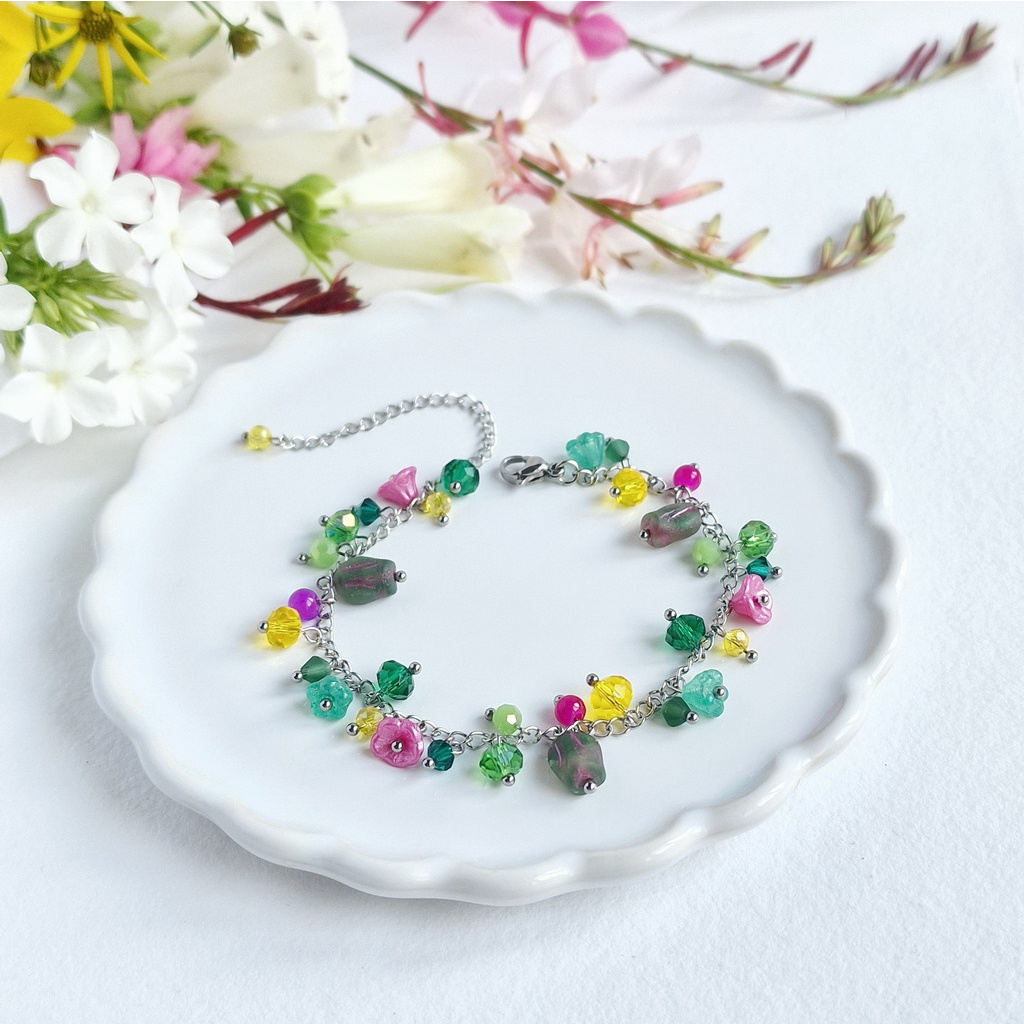 Kombinuje něžnou krásu květů z polymerových hmot, lesk a třpyt skleněných korálků a pevnost a odolnost nerezové oceli.