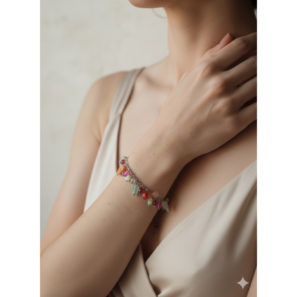 Kouzelný náramek osázený množstvím rozmanitých skleněných krystalů v dokonalé symfonii barev. Každý pohyb náramku doprovází jemné, melodické cinkání, které podtrhuje lehkost a hravost tohoto půvabného doplňku.
