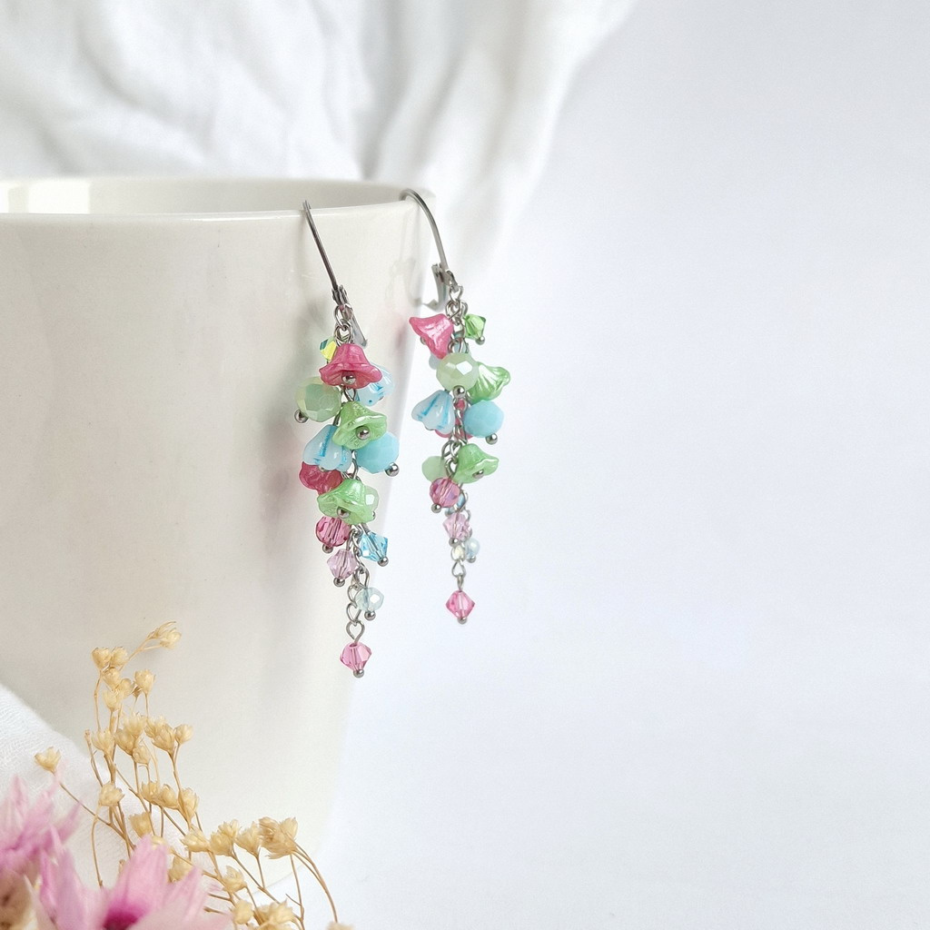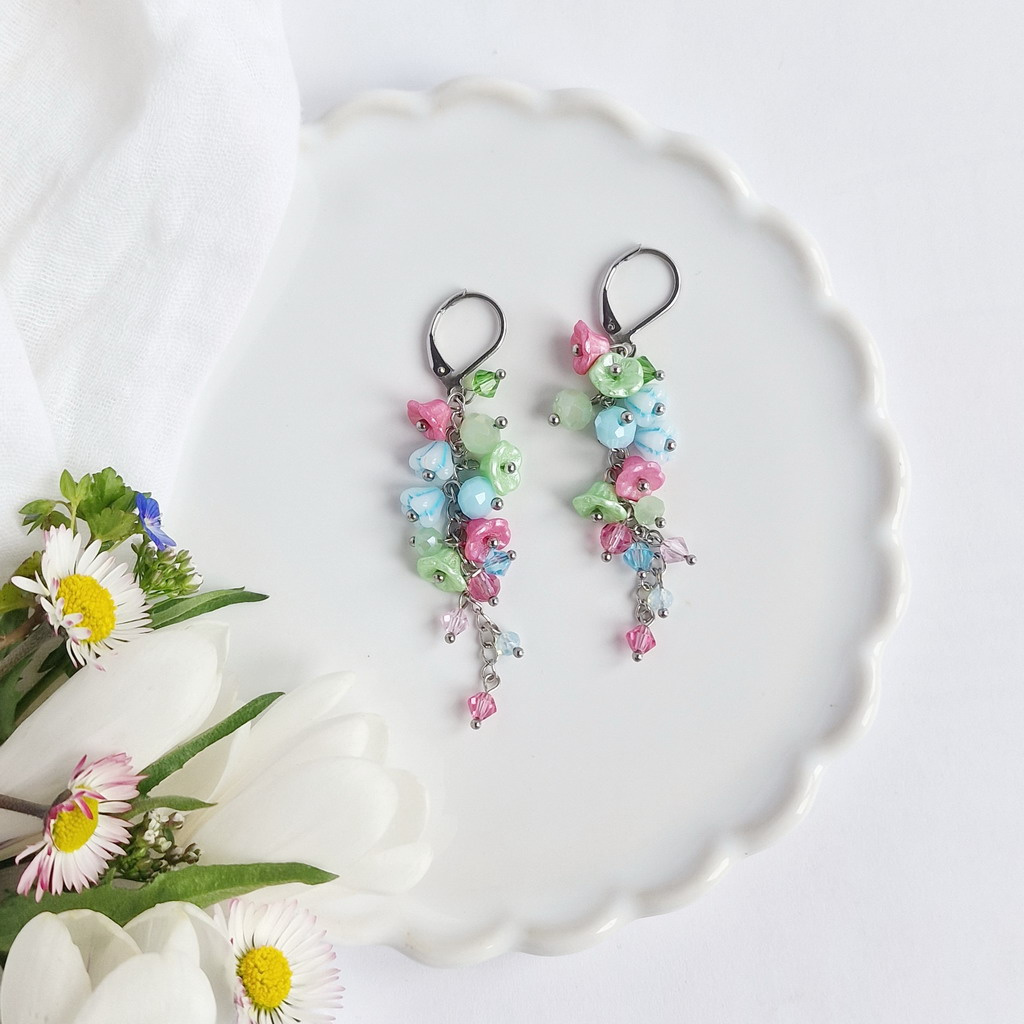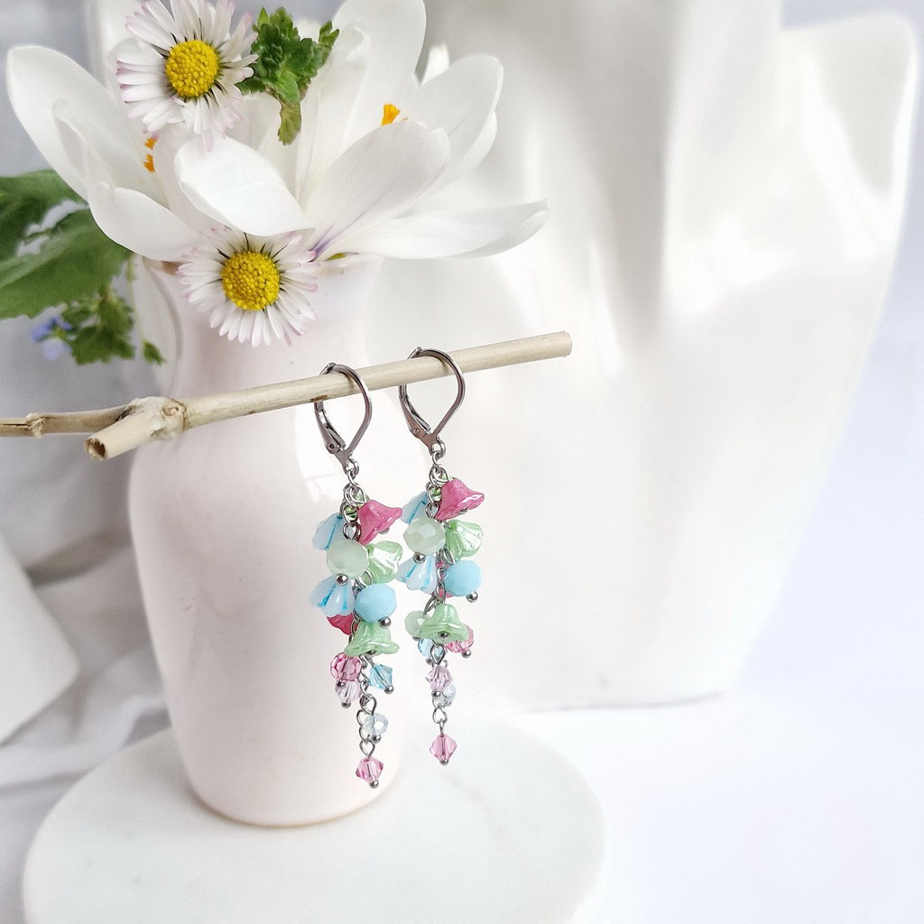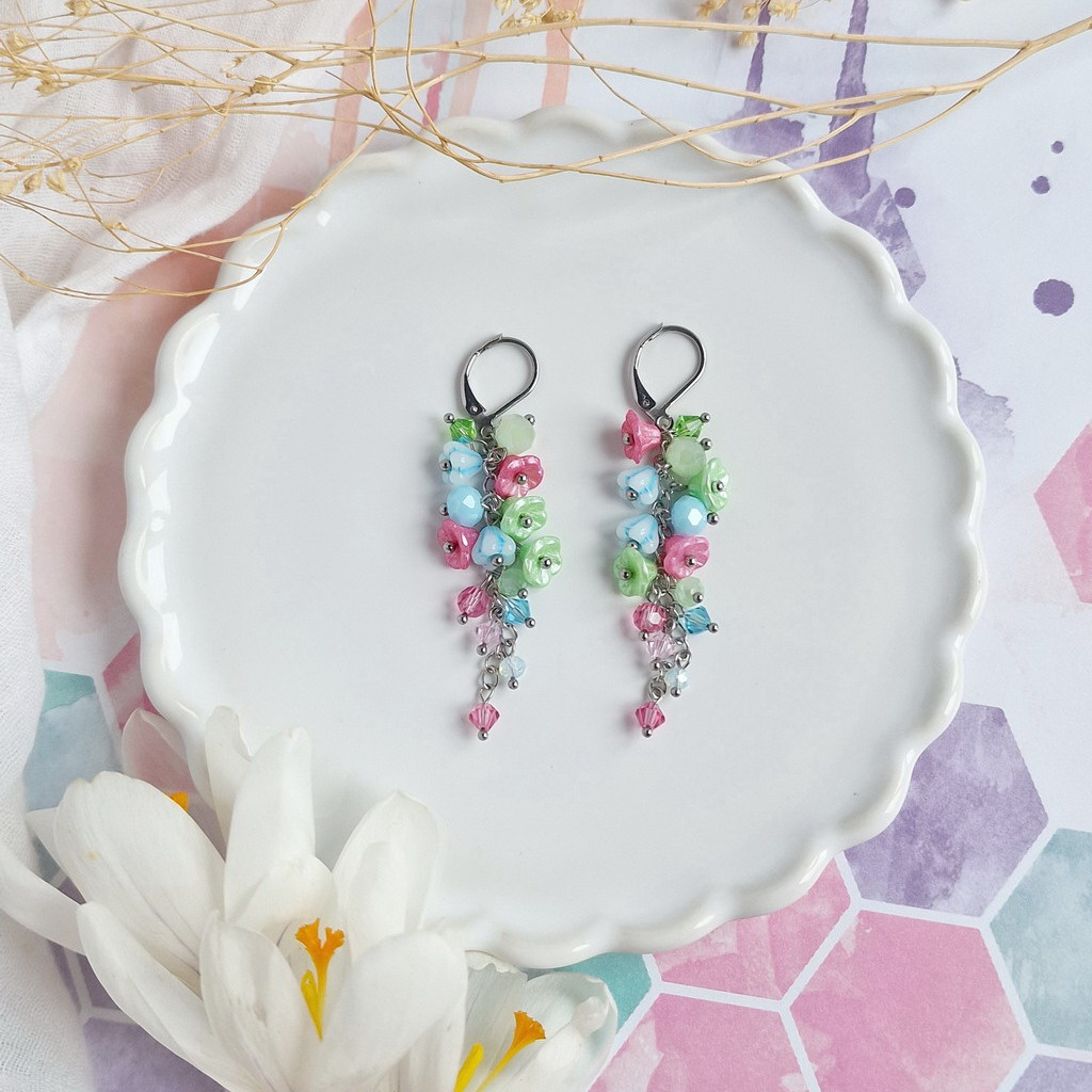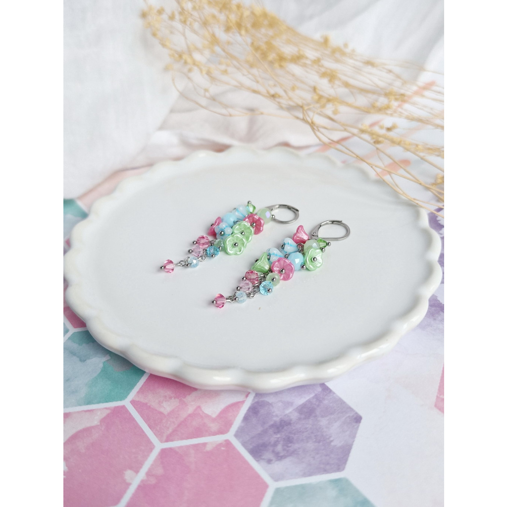 Nápadité náušnice s kouzelnými skleněnými květinkami a krystalky, které se jemně třpytí, jako ranní rosa v trávě. ♡