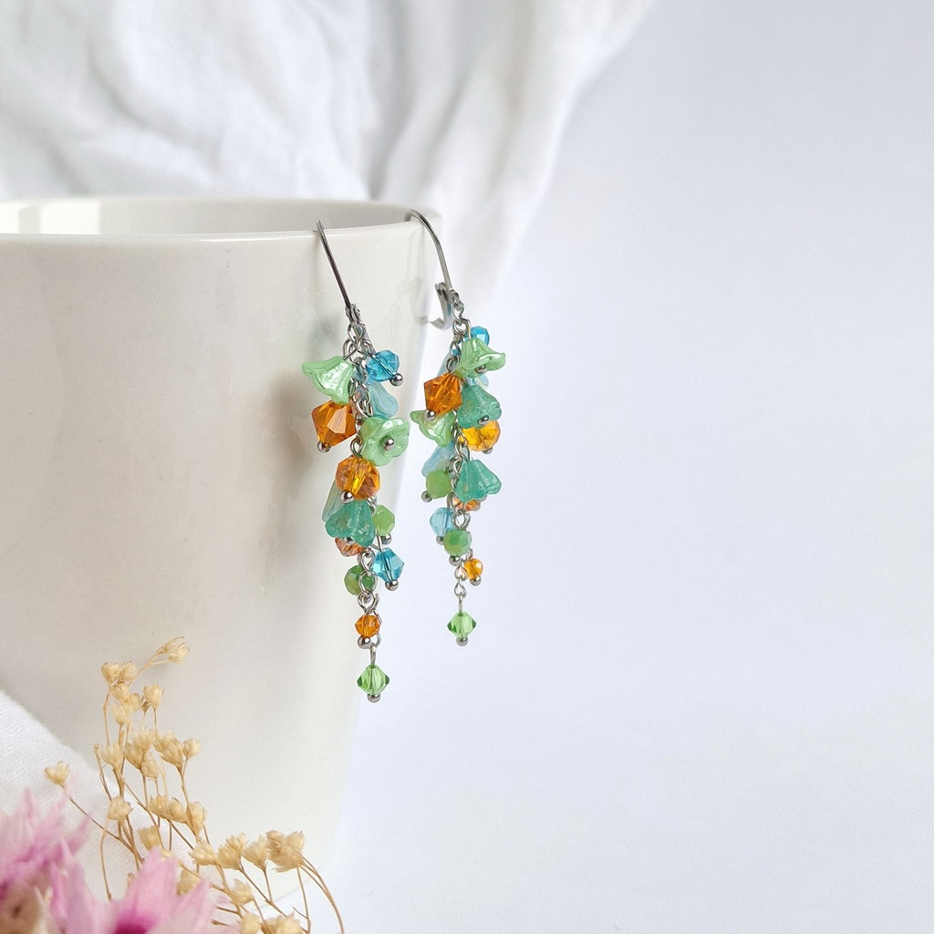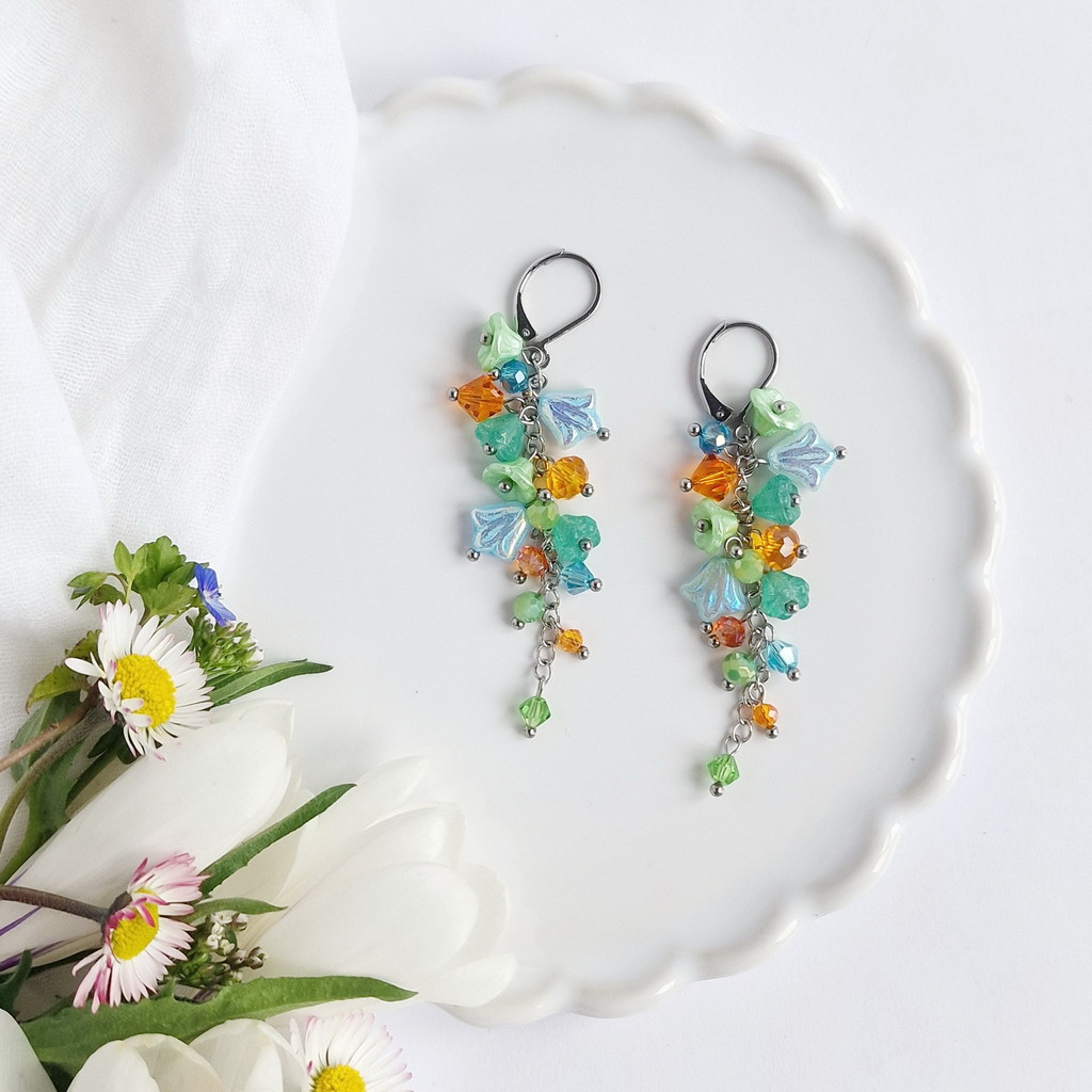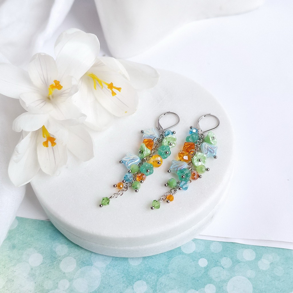 Nápadité náušnice s kouzelnými skleněnými květinkami a krystalky, které se jemně třpytí, jako ranní rosa v trávě. ♡