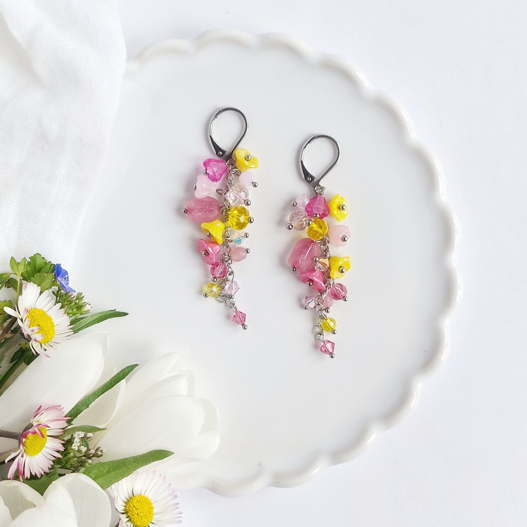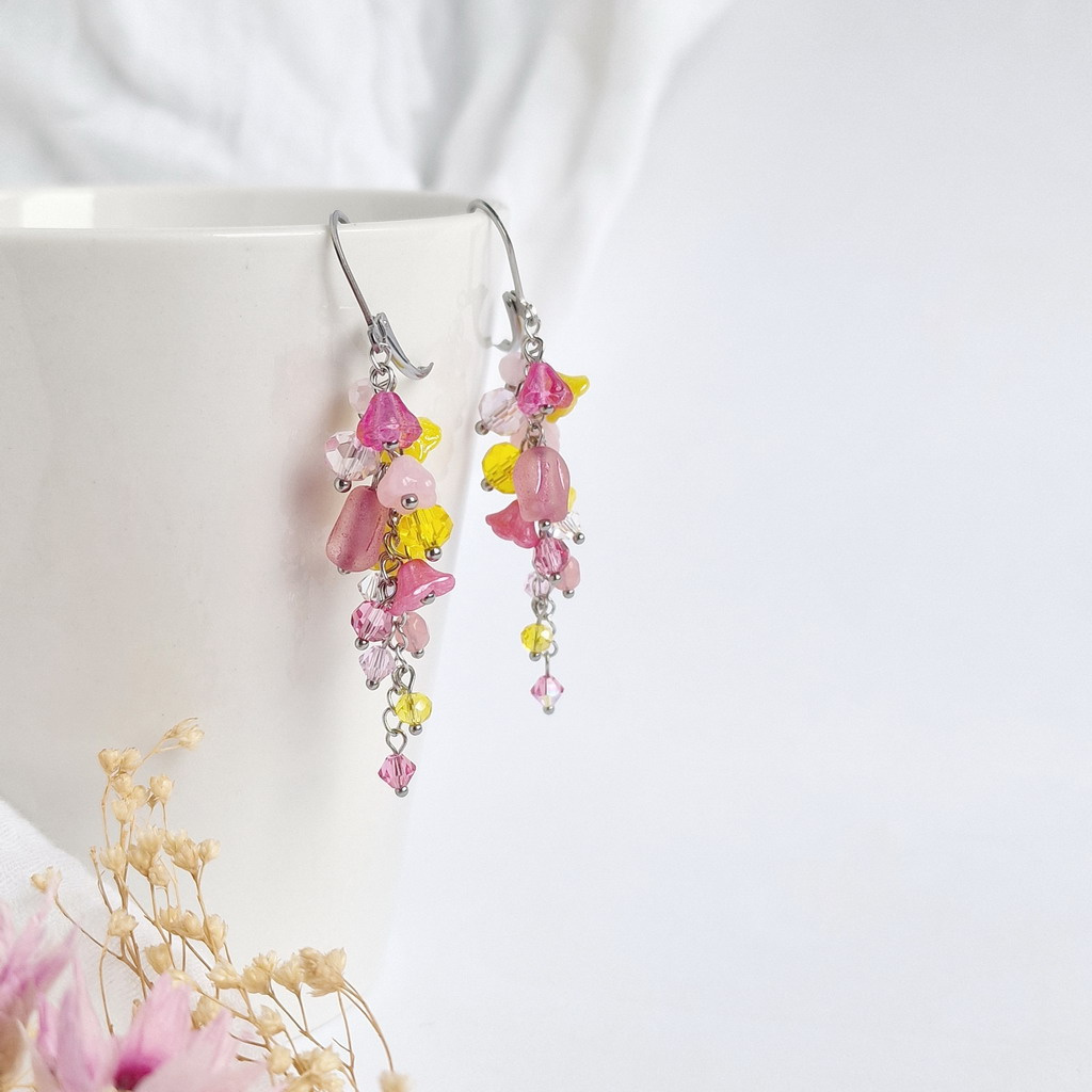 Nápadité náušnice s kouzelnými skleněnými květinkami a krystalky, které se jemně třpytí, jako ranní rosa v trávě. ♡