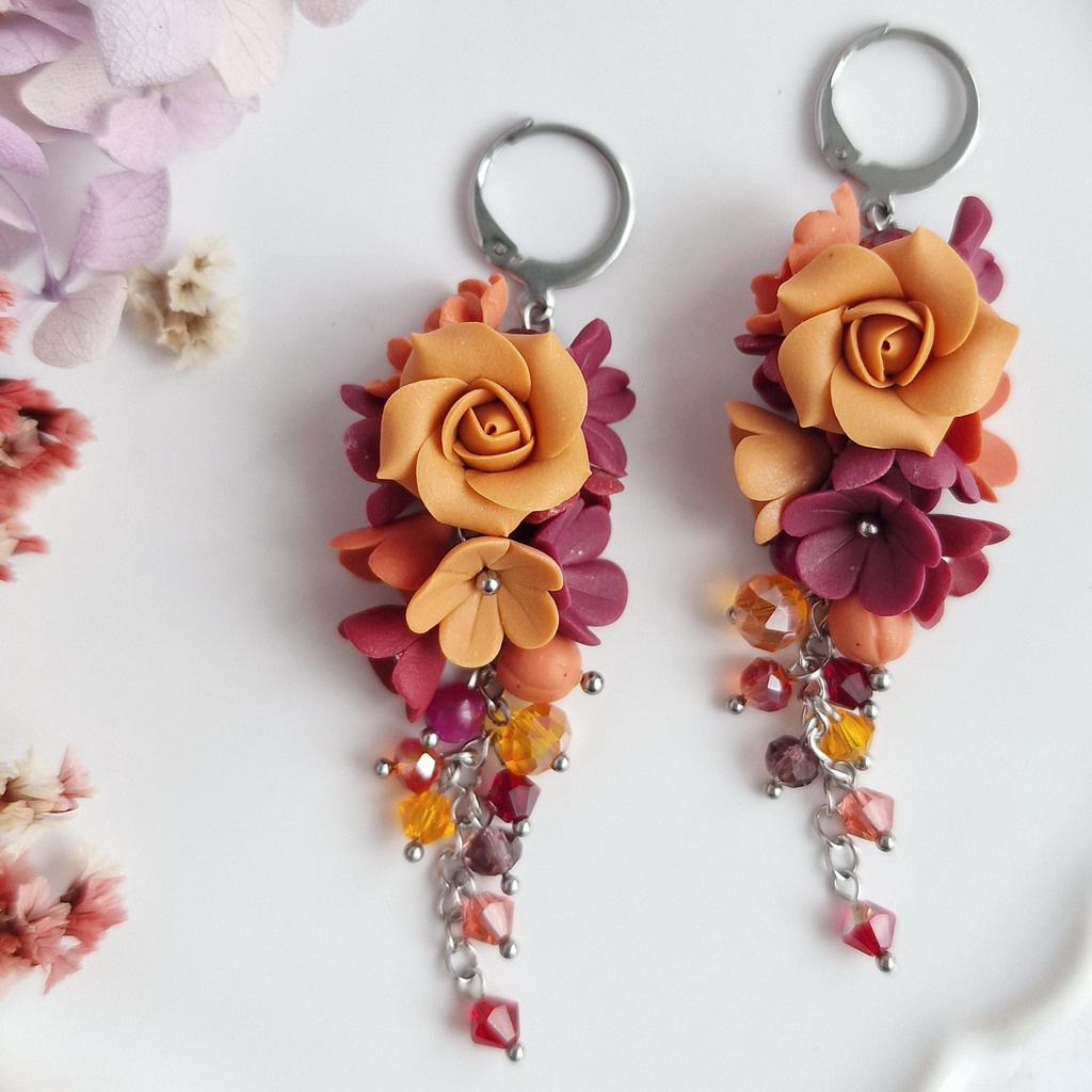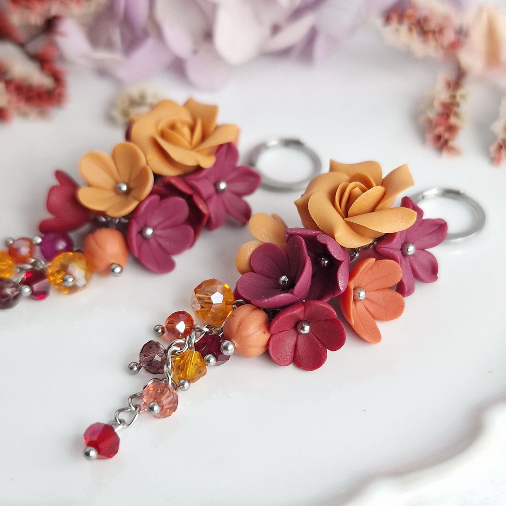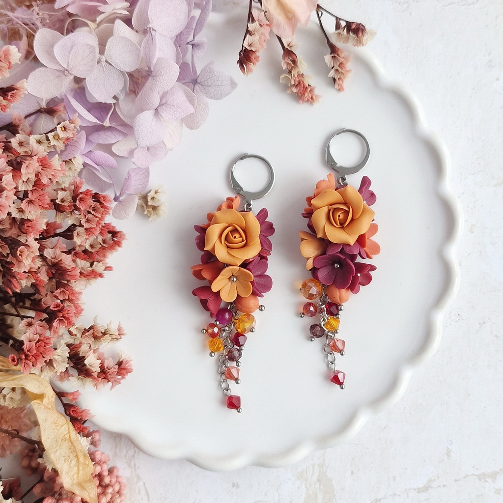 Jsou zhotovené z chirurgické oceli, takže se nemusíte bát alergických reakcí ani změny barvy kovu. Každý pár zdobí množství ručně tvořených květů v nádherné kombinaci podzimních barev.