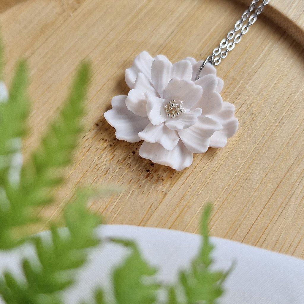 Nádherný velký květ ručně skládaný z jemných okvětních plátků doplněných stříbřitými středy. Lehký a nevšední, jako z andělského krajkoví.