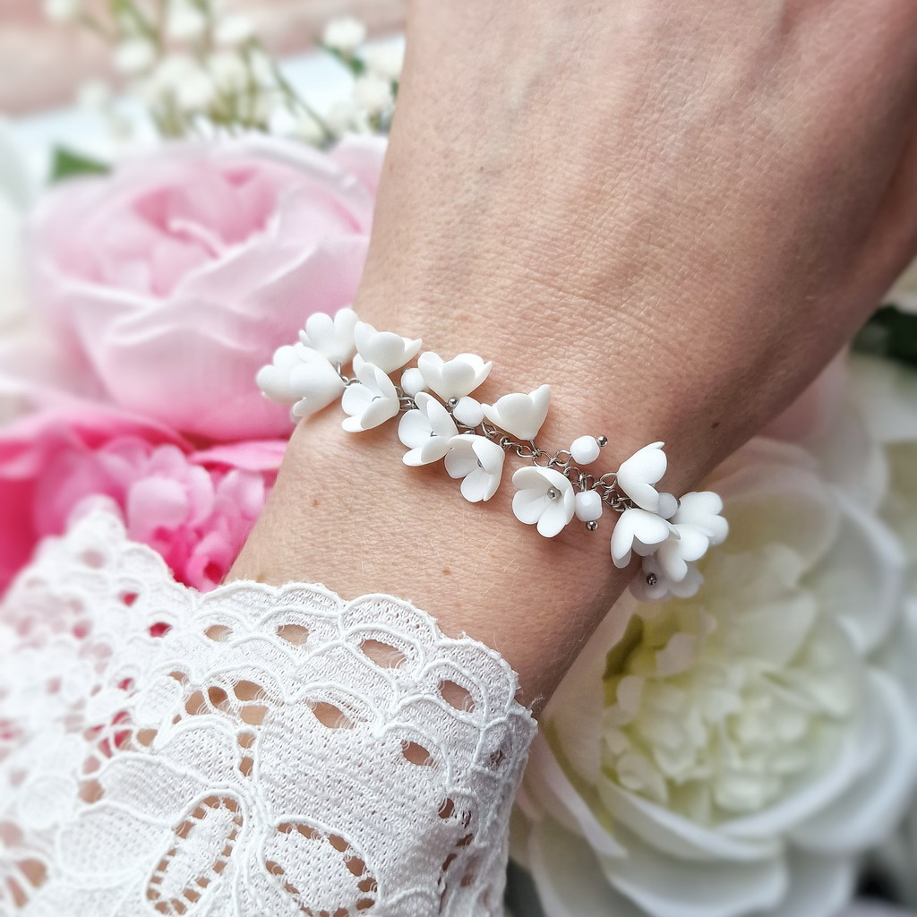 Kouzelný náramek s ručně tvořenými kvítky a skleněnými krystaly dokonale podtrhne uvolněnou atmosféru vaší svatby.