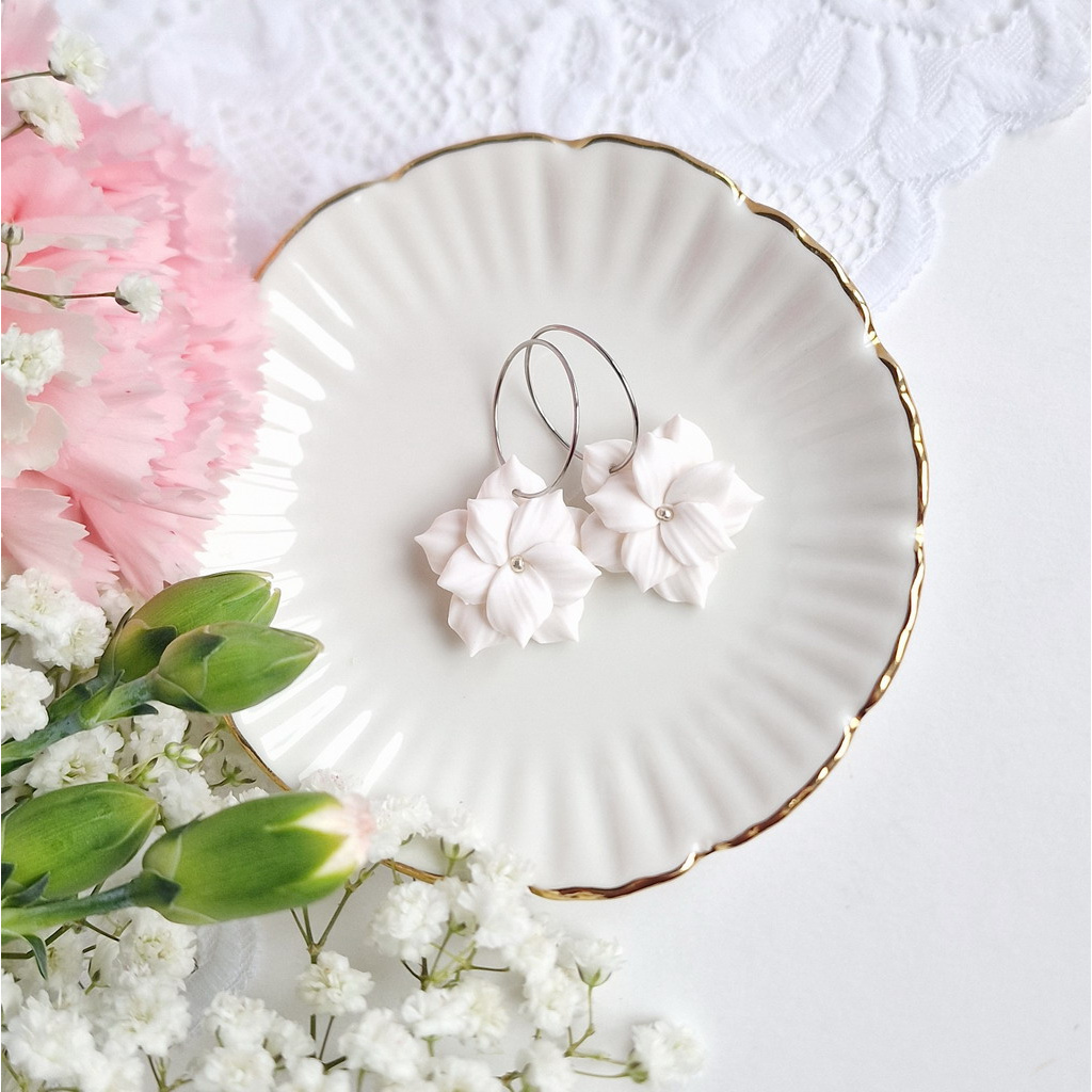 Nápadité náušnice v podobě větších nadýchaných květů zavěšených na jemných kruzích z chirurgické oceli.